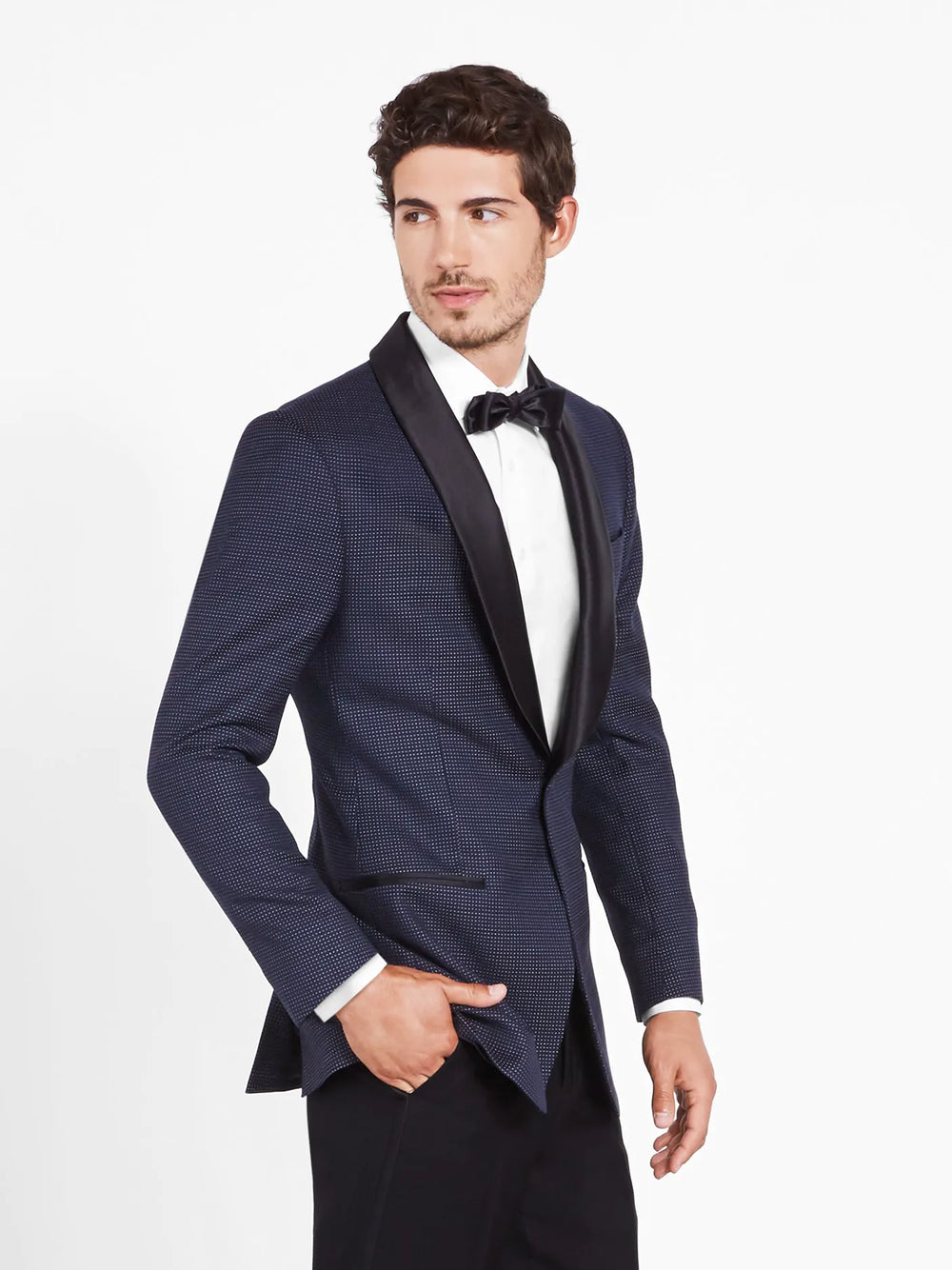 Crafted with a subtle pin dot pattern and black satin shawl collar, this dinner jacket pokes holes in the dated idea that formalwear requires restraint. Includes jacket and pants. Pants are available in classic and slim fits.
